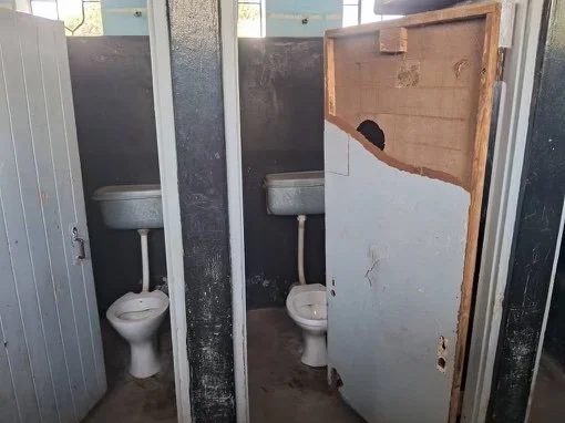 The current bathroom facilities are shown here. There are four stalls (in dire need of repair) and no sinks. These four stalls serve the entire school community of over 1,700 kids.